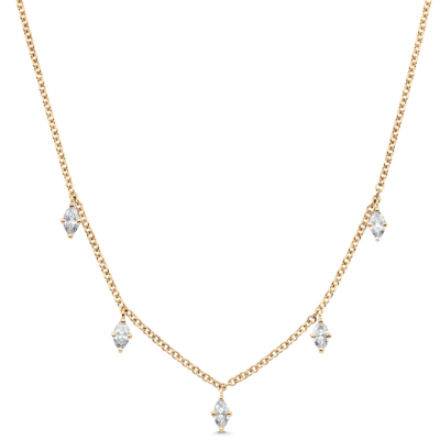 This stunning 18k gold chain can be worn as a choker or a longer necklace. It features five dangling marquise diamonds that make a sparkling statement.