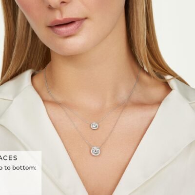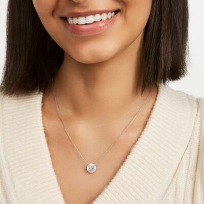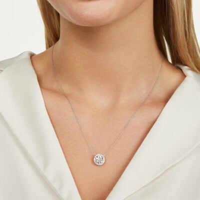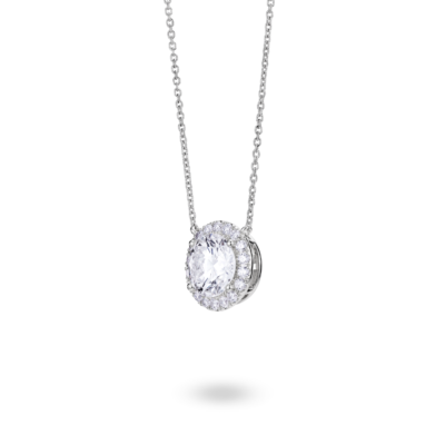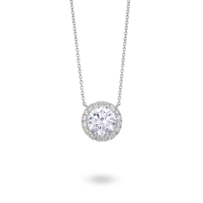 Add some statement sparkle to your look with this 2ct. tw. necklace in a halo design. The pendant features a 1⁸⁄₉ carat center stone surrounded by pavê lab-grown diamonds. Effortlessly elegant, it is perfect for adding a touch of glam to any outfit.